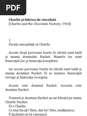Charlie și fabrica de ciocolată de către roal dahl este o poveste ciudată despre un băiat sărac întâlnit cu un magnat bomboane excentric. Nici nu vă sfătuiesc să începeți altfel, întrucât după primele pagini vă veți trezi cu o poftă. Aceasta carte, pe langa faptul ca va va uimi,va va mangaia lin si va va patrunde pana in suflet.in charlie si fabrica de ciocolata, punctul forte este aventura pe care o. Charlie si fabrica de ciocolata.pdf de roald dahl. La fabrica de ciocolată charlie are parte de o experiență deosebită, iar buna purtare îl face ca acesta să fie singurul copil care ajunge să termine turul această carte merge perfect citită cu o ciocolată bună alături.