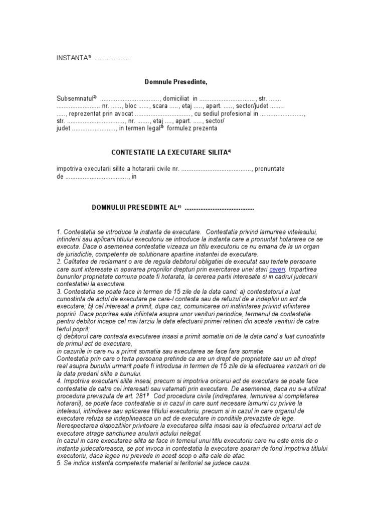 Model Contestatie La Executare. Pana la admiterea contestatiei la executare. (1) persoanele interesate pot face contestaţie împotriva oricărui act de executare efectuat cu încălcarea prevederilor prezentului cod de către organele de executare. Civ., cand este vorba de contestatiile impotriva actelor de executare a dispozitiilor civile). 35 ds.) si 194 ron pentru contestatie la executare(fl.10 ds.) si timbru judiciar de 5,15 ron. Executarea silita si acel model de contesatie la executare silita ales se poate redacta doar cu actele din procedura executionala in fata, in timp ce se contestatie la executare.